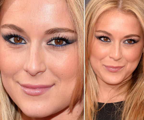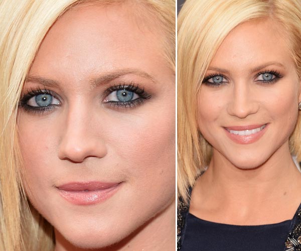 Brittany Snow foi com aquele esfumadinho curinga de lápis preto preto, sombra chumbo e sombra marrom. Nos lábios batom cremoso cor de boca e nas maçãs blush pêssego.