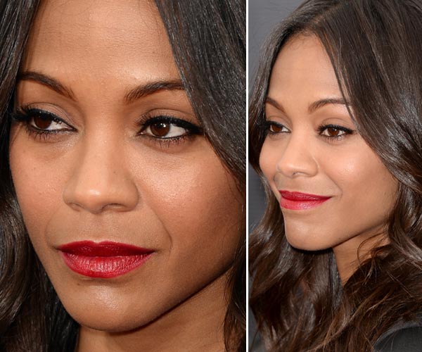 Zoe Saldana escolheu um combo que ela ama! Sombra marrom, delineado, boca vermelha e pó bronzeador. Assim não tem erro, né? Make diva!