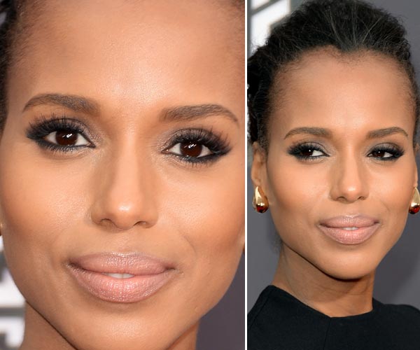 Kerry Washington deusa com um make esfumado com sombra malva/taupe cintilante, sombra marrom e contorno de lápis preto. Nos lábios nude e nas maçãs bronzer e iluminador. Fina e rica!
