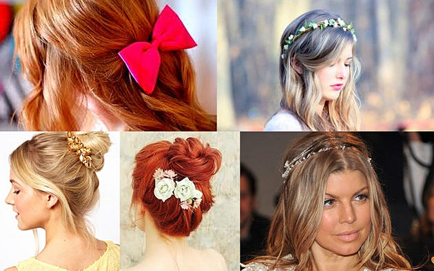 Broches, tearas, coroinhas de flores, lacinhos, liguinhas com strass ou perolas, turbantes e etc. As variedades são gigantescas.